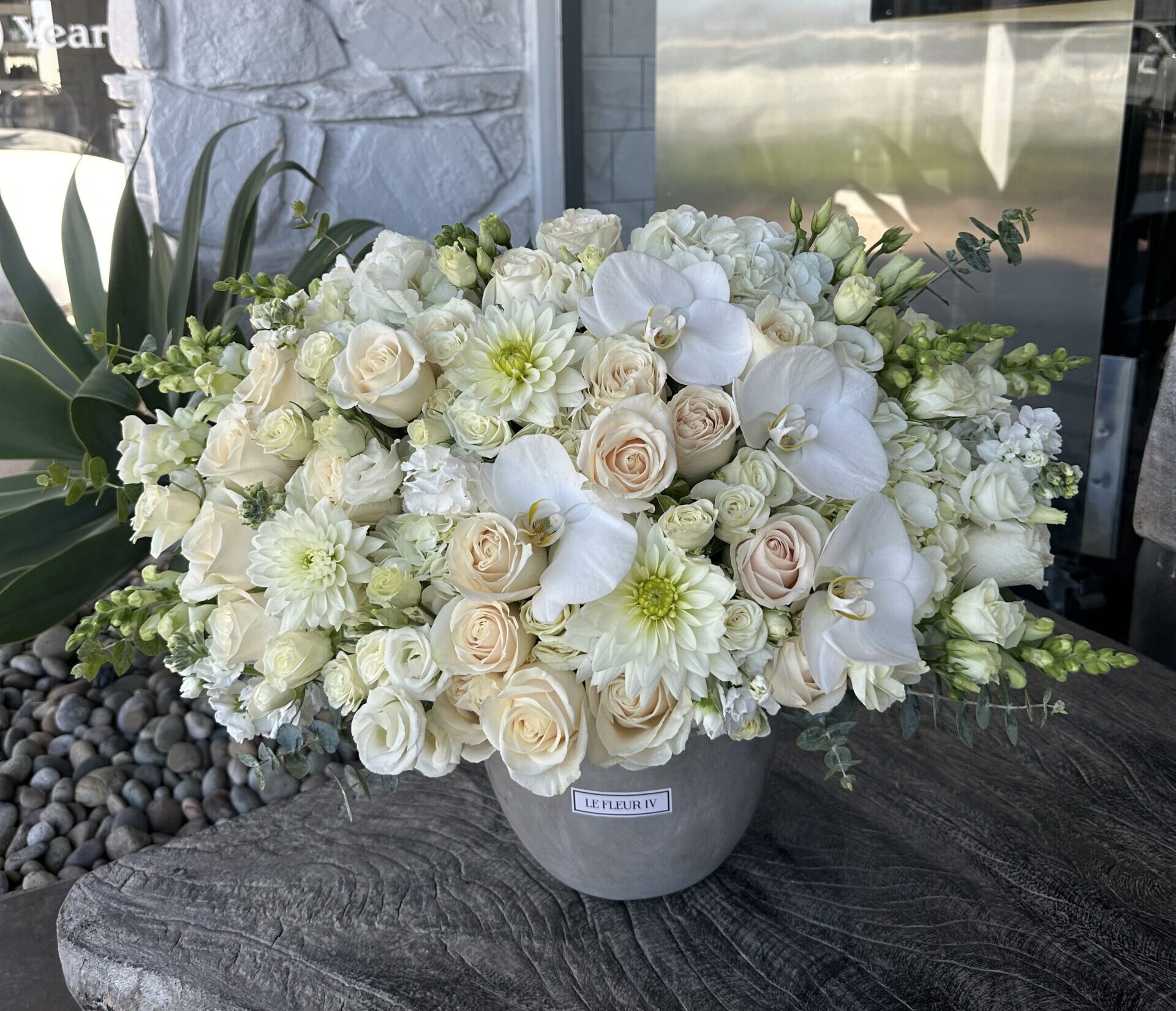 Roses, orchids, dahlias, stocks, hydrangeas, snapdragons, etc. in concrete vase.