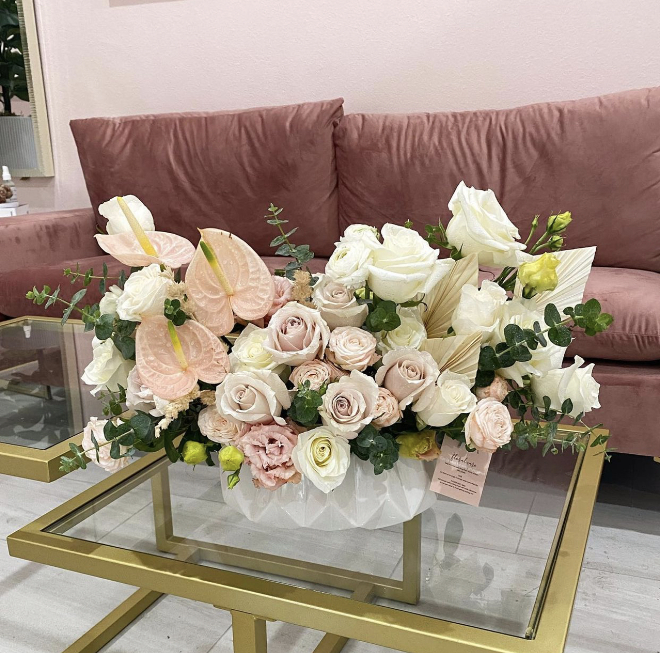 Roses, anthuriums, palms, etc in white vase.