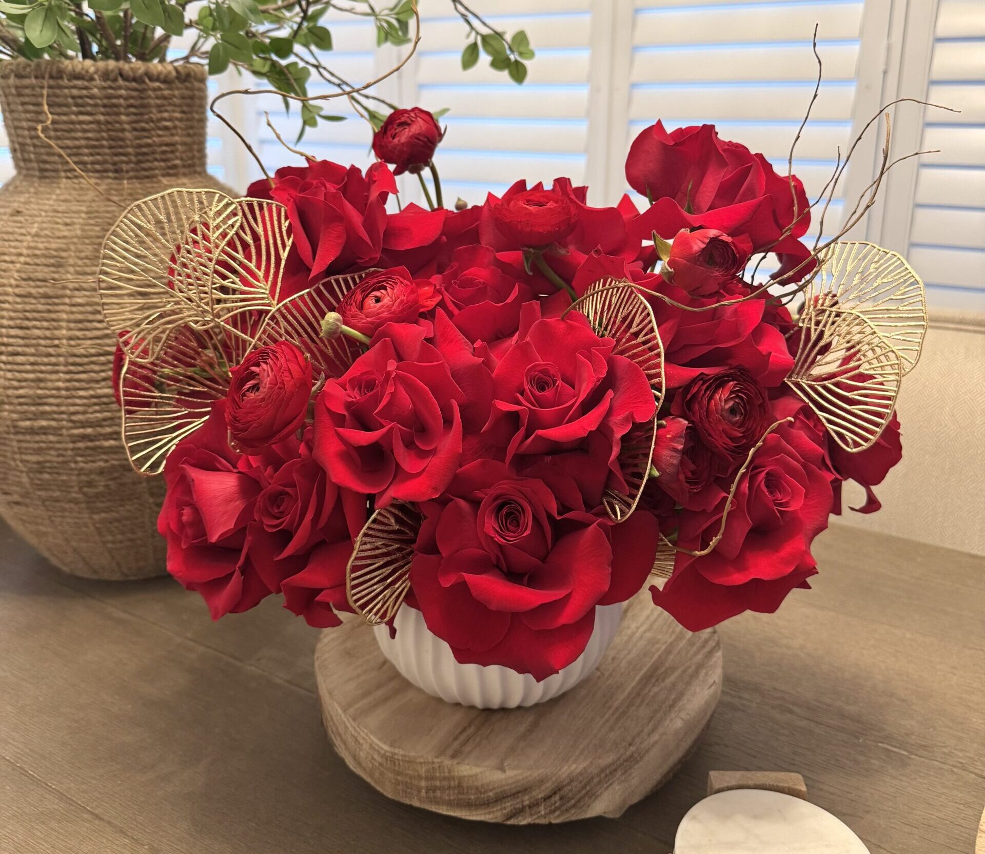 Roses, ranunculuses, and willow, with gold gingko leaves in ceramic vase.