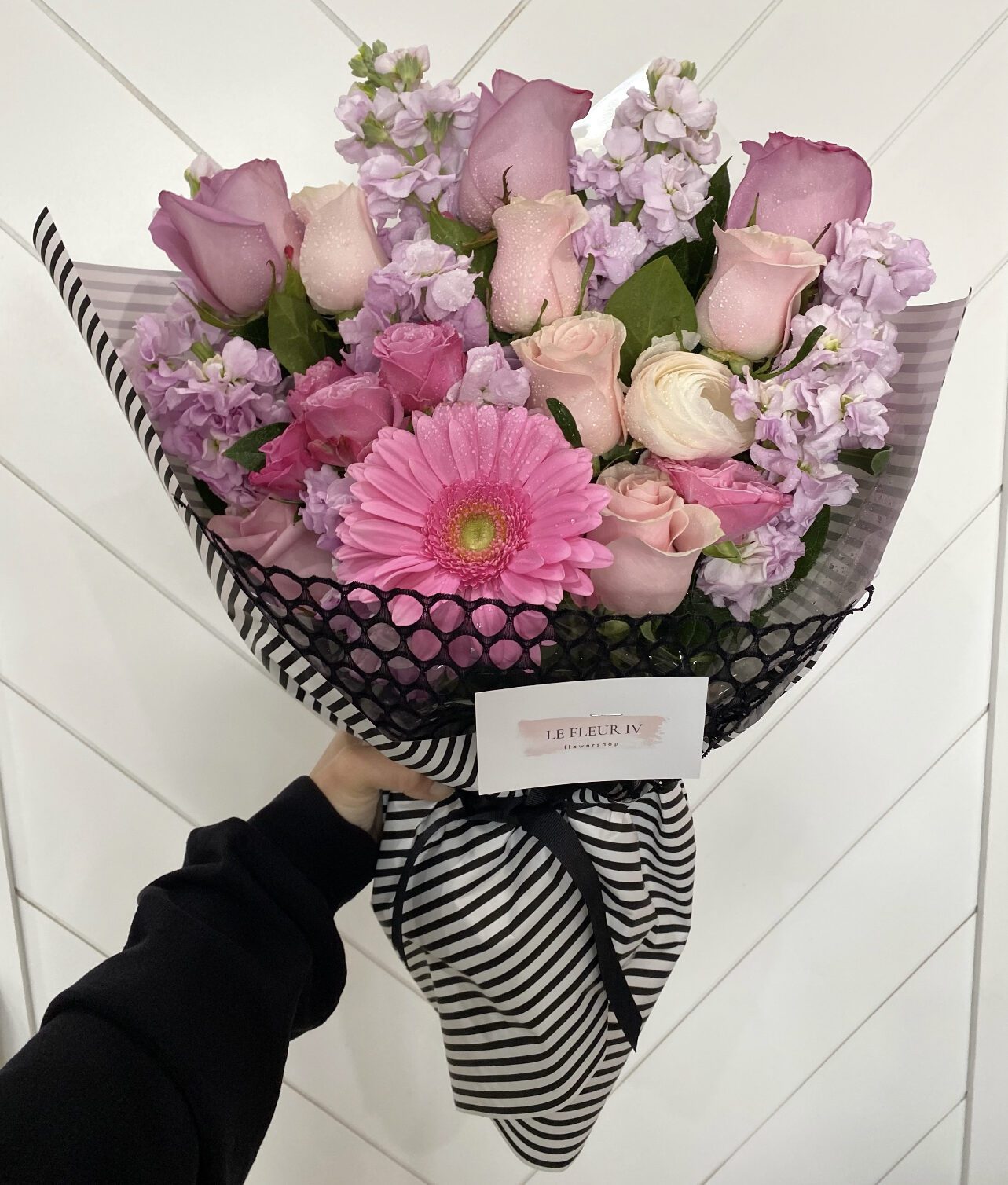 Roses, gerbera daisies, stocks, etc. in black and stripes deluxe wrap bouquet.