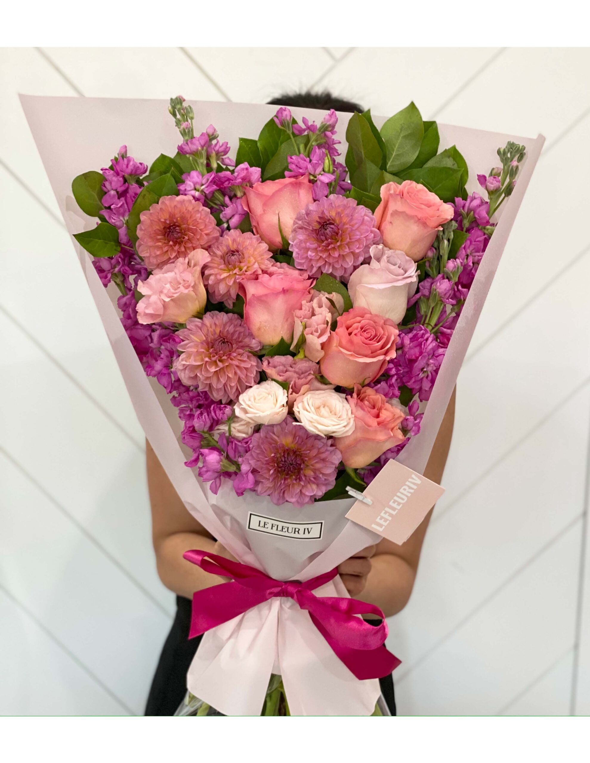 Roses, dahlias, lisianthus, stocks, etc. in pink deluxe wrap bouquet