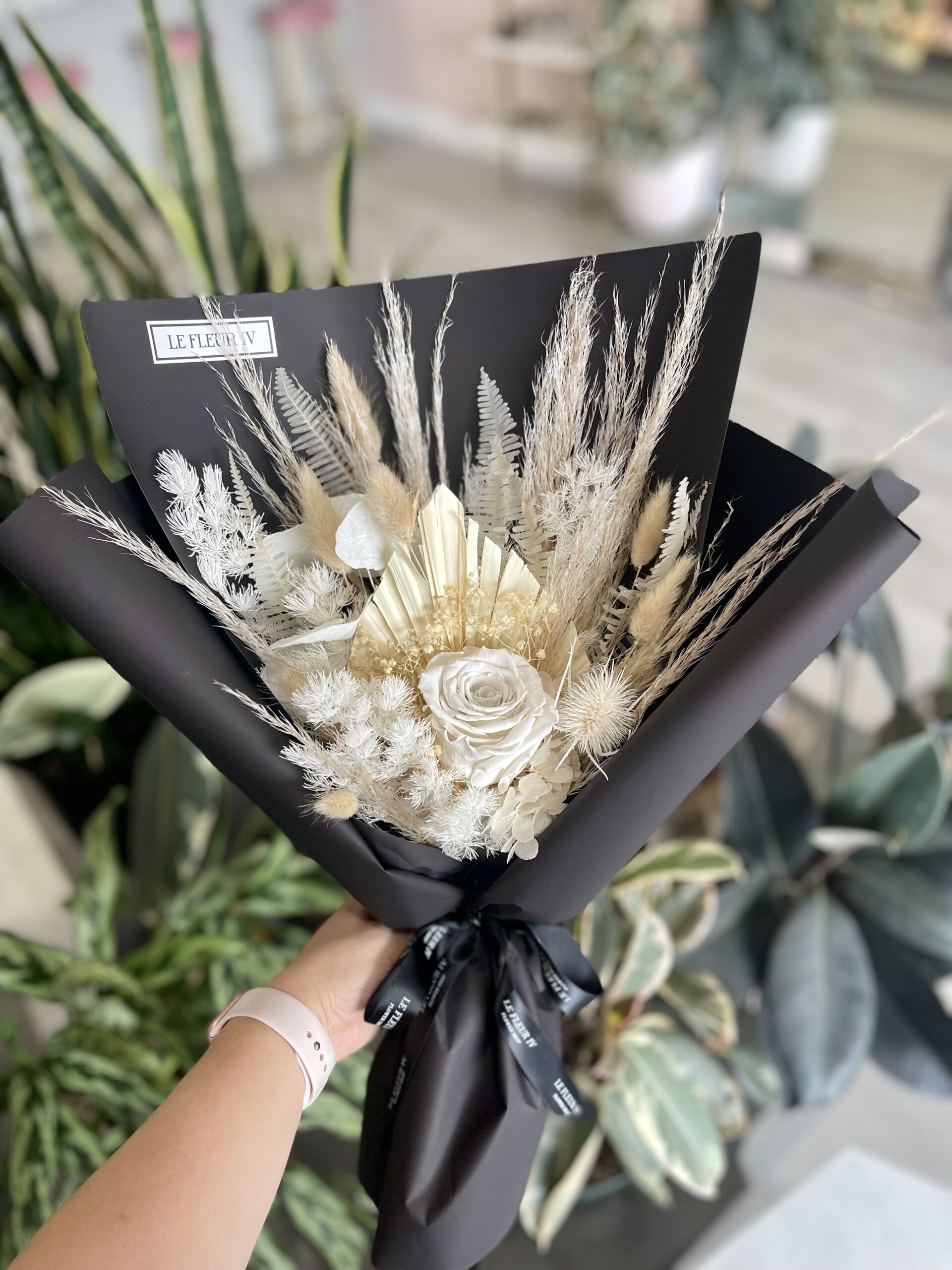 Single forever rose bouquet. Real flowers and foliage preserved to last many years.