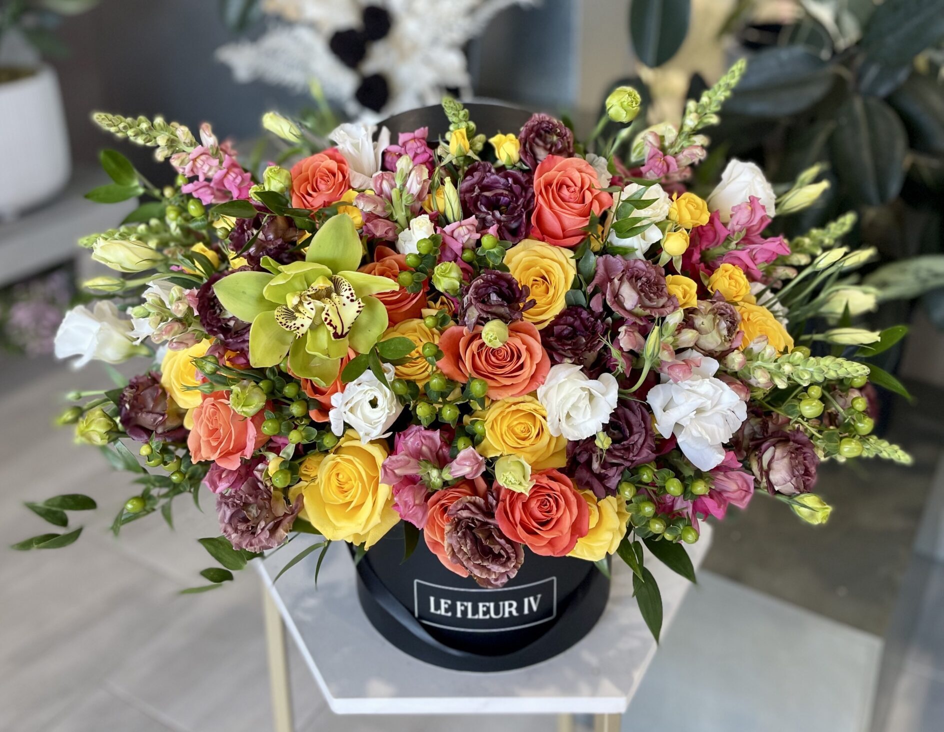 Mixed flowers in round signature flower box – roses, lisianthus, coffee beans, snap dragons, etc.