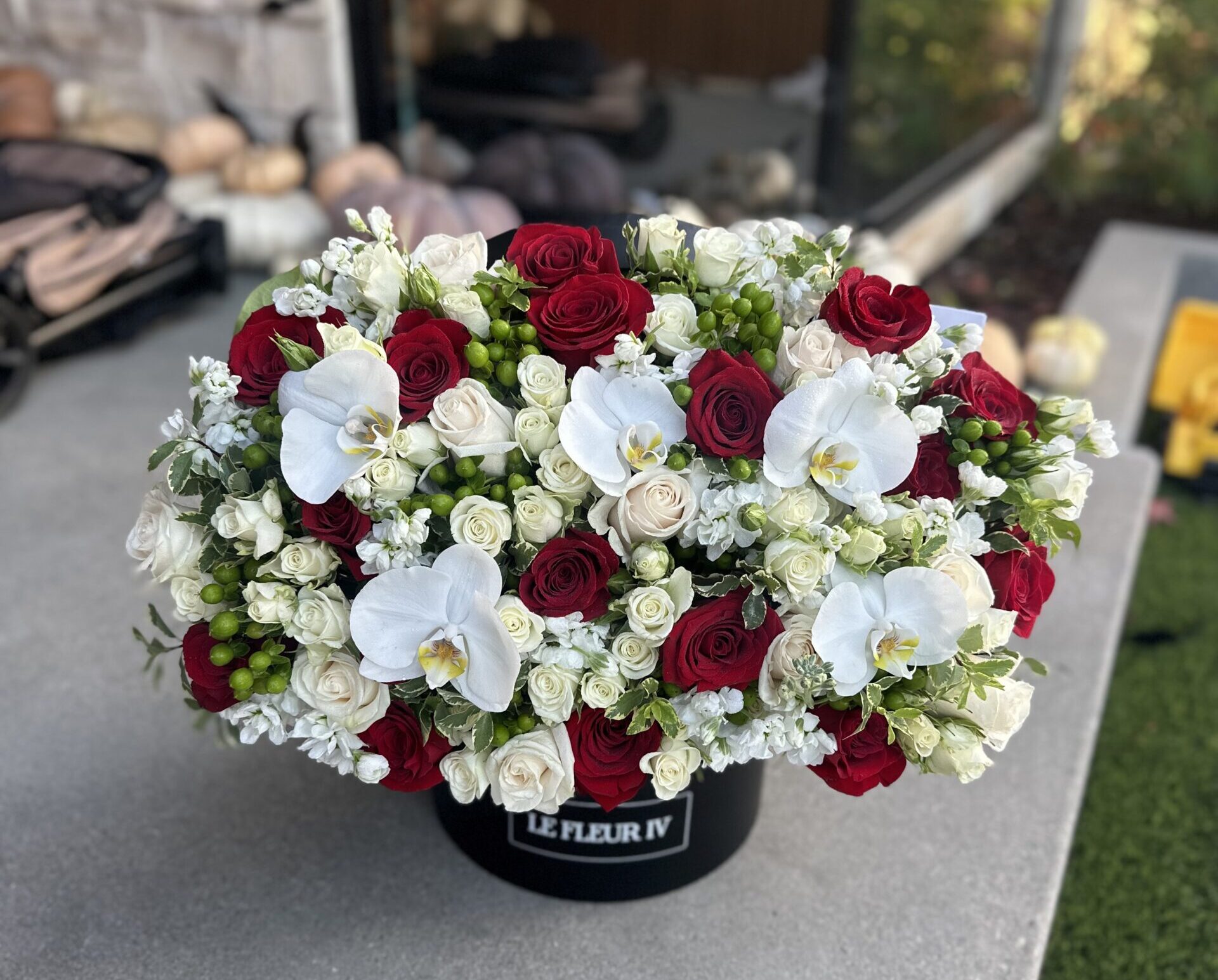 Mixed flowers in round signature flower box – roses, phalaenopsis orchids, coffee bean, stocks, etc.