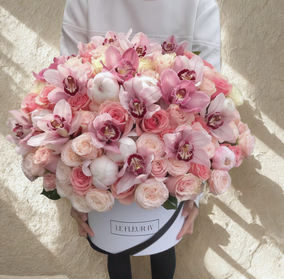 Mixed flowers in white round signature flower box – roses, peonies, cymbidium orchids, etc.
