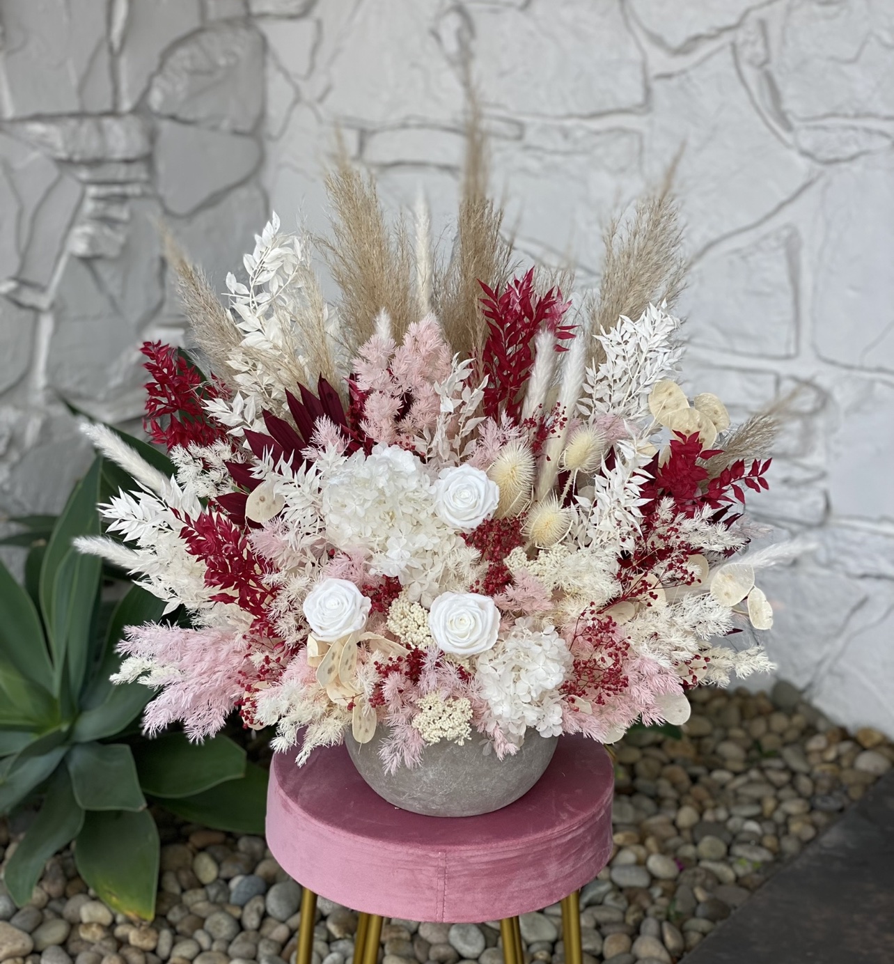 Pampas arrangement in ceramic vase. Real flowers and foliage preserved to last many years.