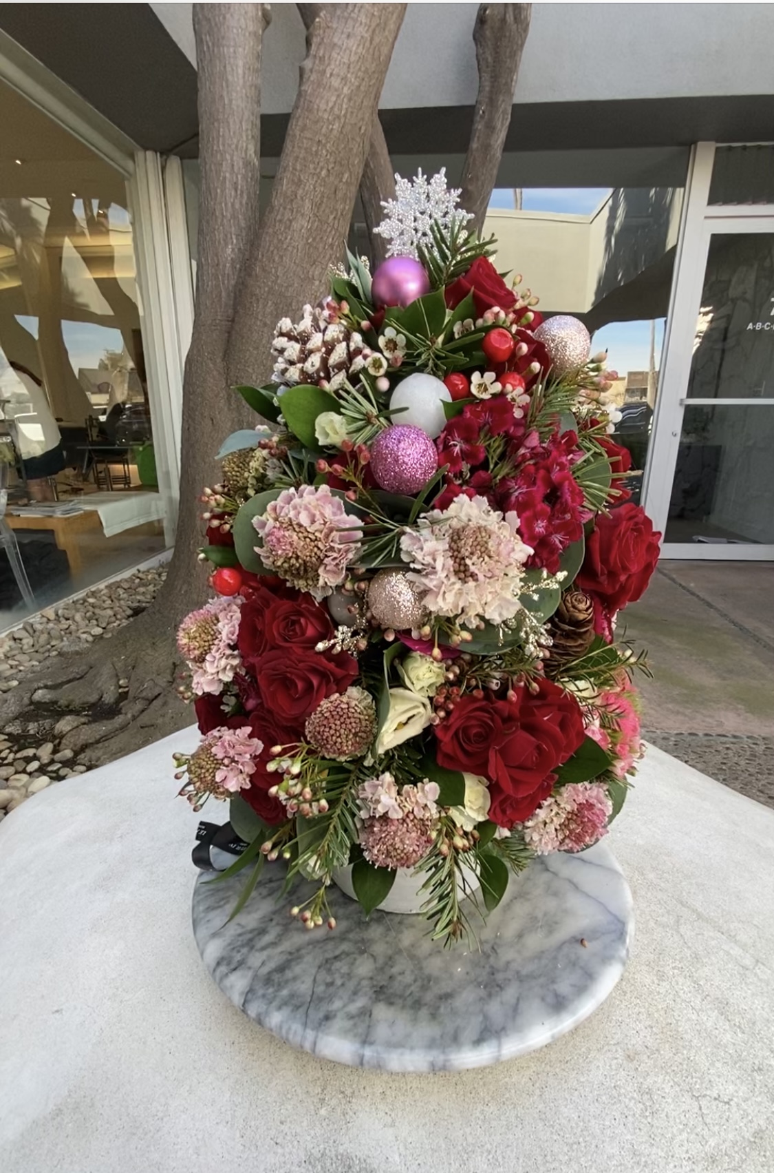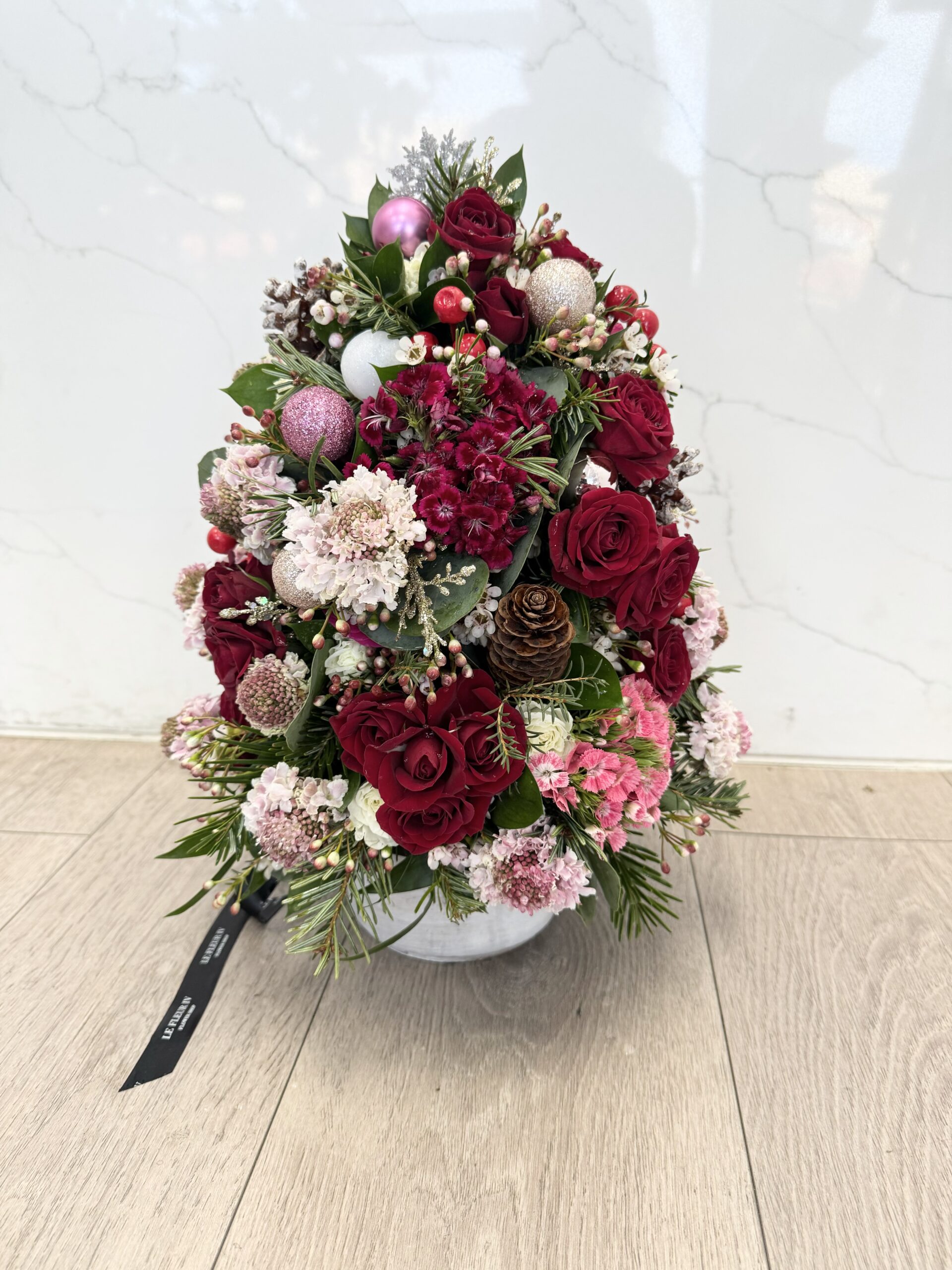 Pine, pinecones, roses, sweet william, scabiosa, wax flowers, ornaments, etc. in ceramic pot. All around facing. Around 15″ tall.