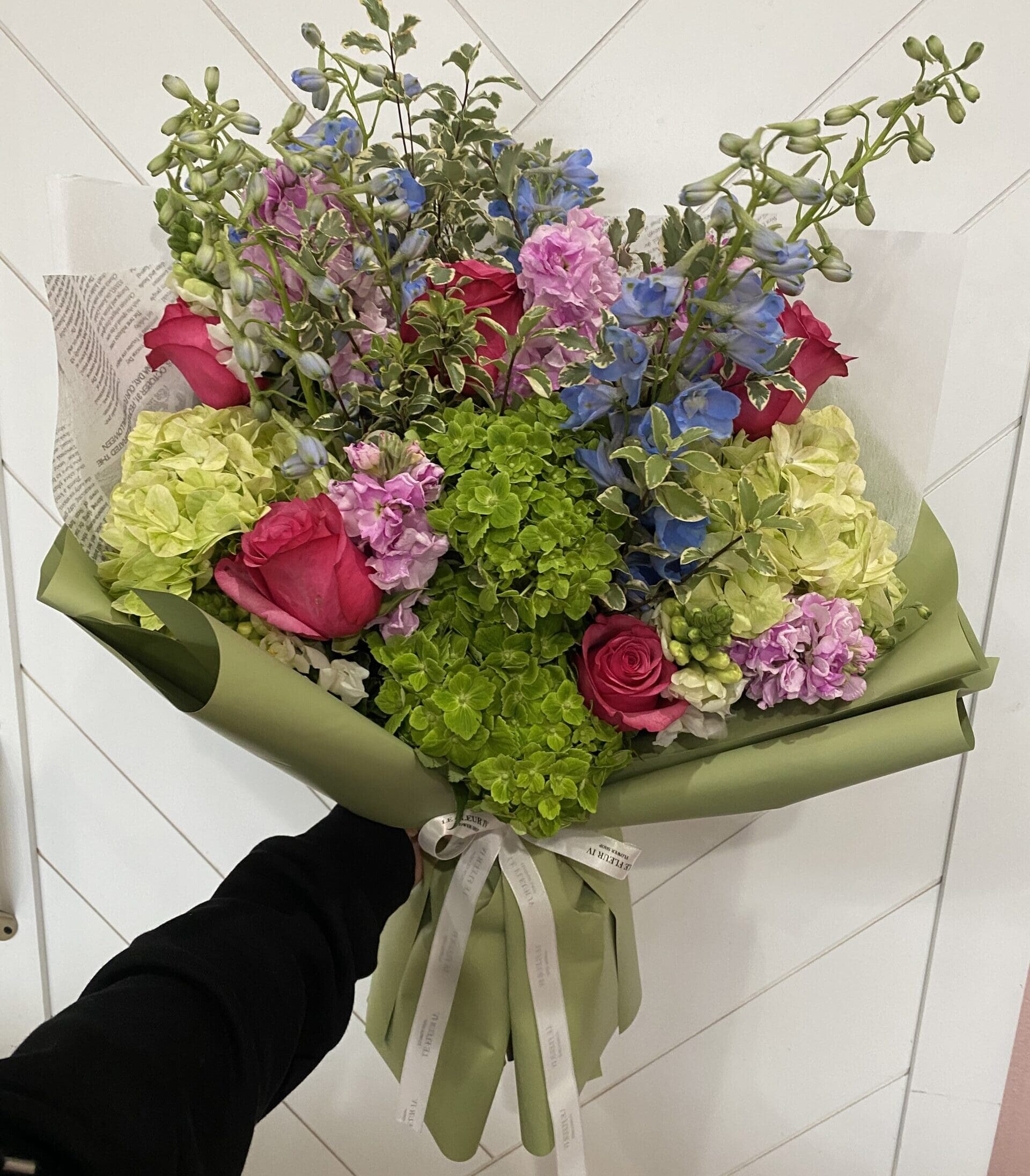 Roses, hydrangeas, delphiniums, etc. in deluxe wrap bouquet.