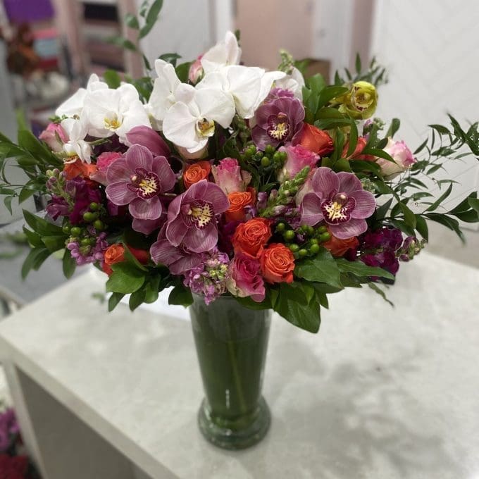 *This is an actual customer order. Please note that your arrangement and vase will be similar and not identical, depending on availability, freshness, and seasonality. If certain florals, foliage, vase, and/or wrapping paper are not available, we will replace with an item of equal or higher value.