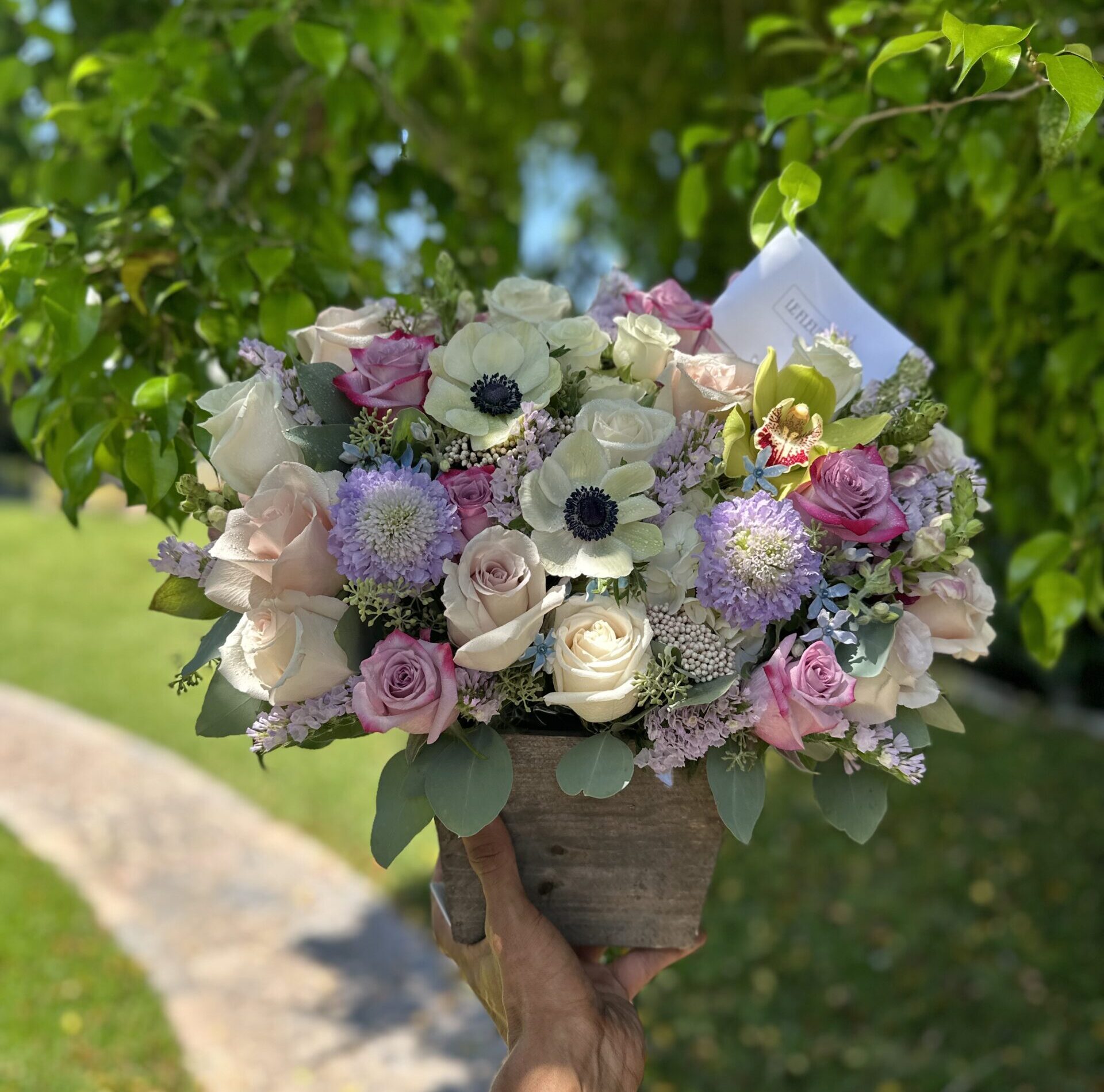 *This is an actual customer order. Please note that your arrangement and vase will be similar and not identical, depending on availability, freshness, and seasonality. If certain florals, foliage, vase, and/or wrapping paper are not available, we will replace with an item of equal or higher value.