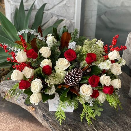 *This is an actual customer order. Please note that your arrangement and vase will be similar and not identical, depending on availability, freshness, and seasonality. If certain florals, foliage, vase, and/or wrapping paper are not available, we will replace with an item of equal or higher value.