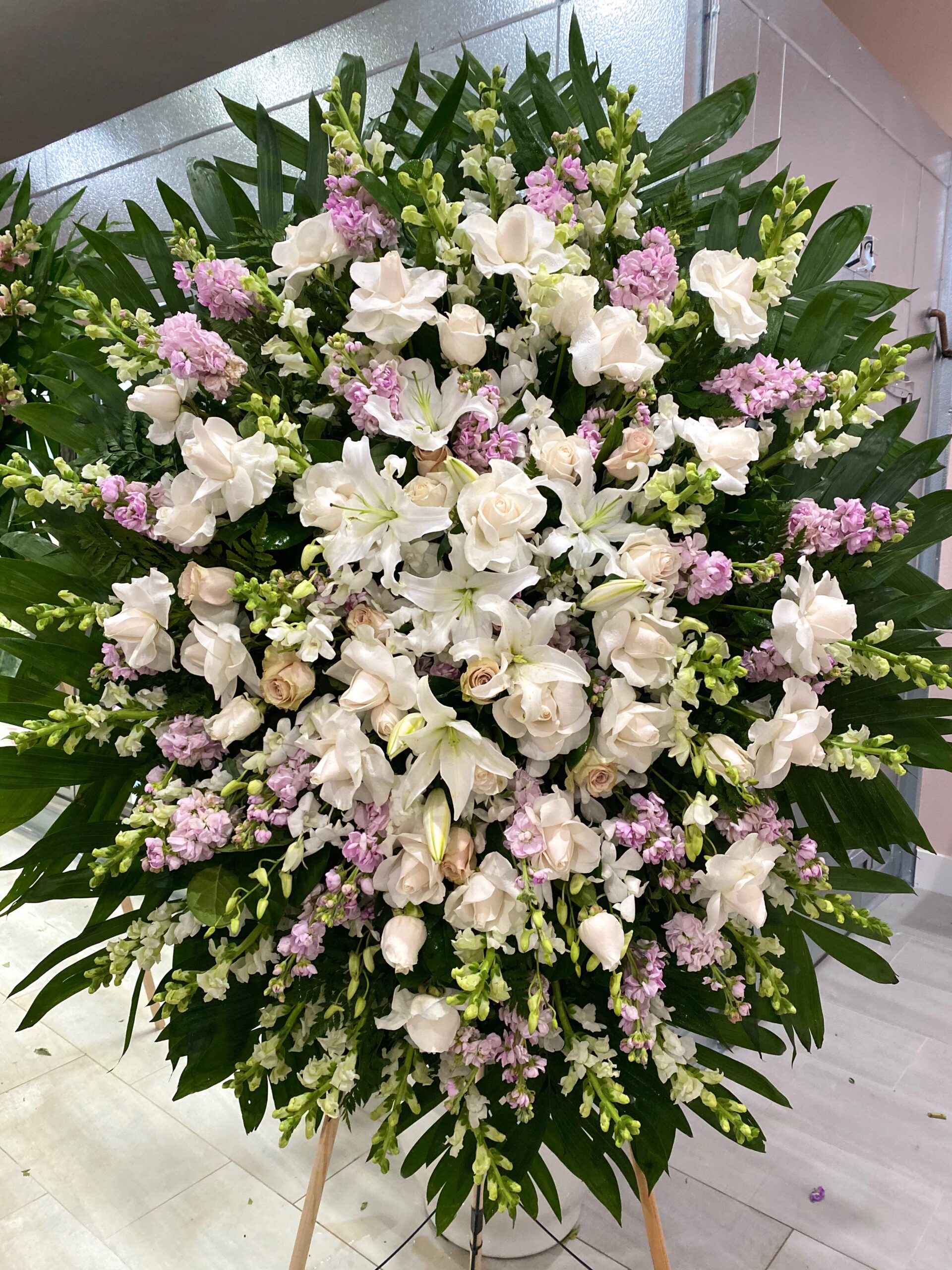 X-Large funeral spray. Wreath is approx. 5ft x 5.5ft. Stand included. Custom message banners included.