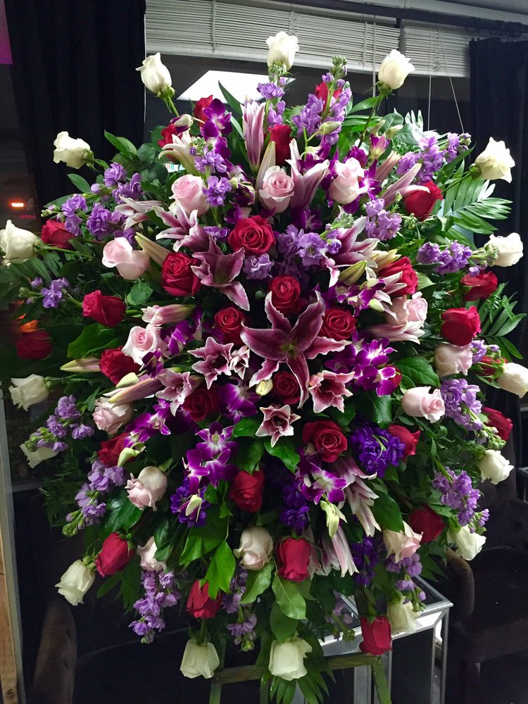 *This is an actual customer order. Please note that your arrangement and banner color will be similar and not identical, depending on availability, freshness, and seasonality. If certain florals or foliage are not available, we will replace with an item of equal or higher value.